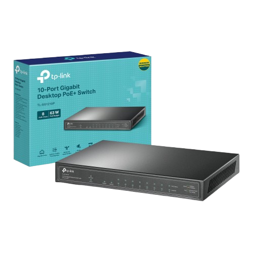 The TP-Link TL-SG1210P is a 10-port Gigabit desktop switch featuring 8 PoE+ ports and 1 Gigabit SFP port for flexible, high-speed network expansion while delivering power and data over a single Ethernet cable. It supports IEEE 802.3af/at and provides up to 30 W per PoE port with a total budget of 63 W, making it ideal for powering devices like IP cameras, VoIP phones, and wireless access points. Built with a fanless, compact metal chassis, it is designed for quiet, desktop or wall-mounted environments. With a 20 Gbps switching capacity, store-and-forward architecture, and advanced features such as QoS, IGMP snooping, and PoE auto-recovery, the TL-SG1210P offers plug-and-play simplicity, stable performance, and reliable power delivery for modern small-scale networks.
